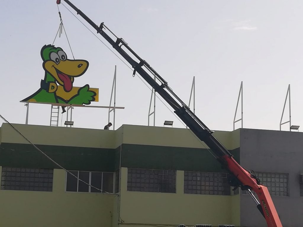 Una cuadrilla de operarios repuso este martes 27 de junio, el letrero luminoso del Supermercado Hiperdino del Cruce de Melenara que se desprendió hace casi un mes, como consecuencia de los fuertes vientos que provocaron la borrasca Óscar a su paso por Telde. ONDAGUANCHE estuvo allí.