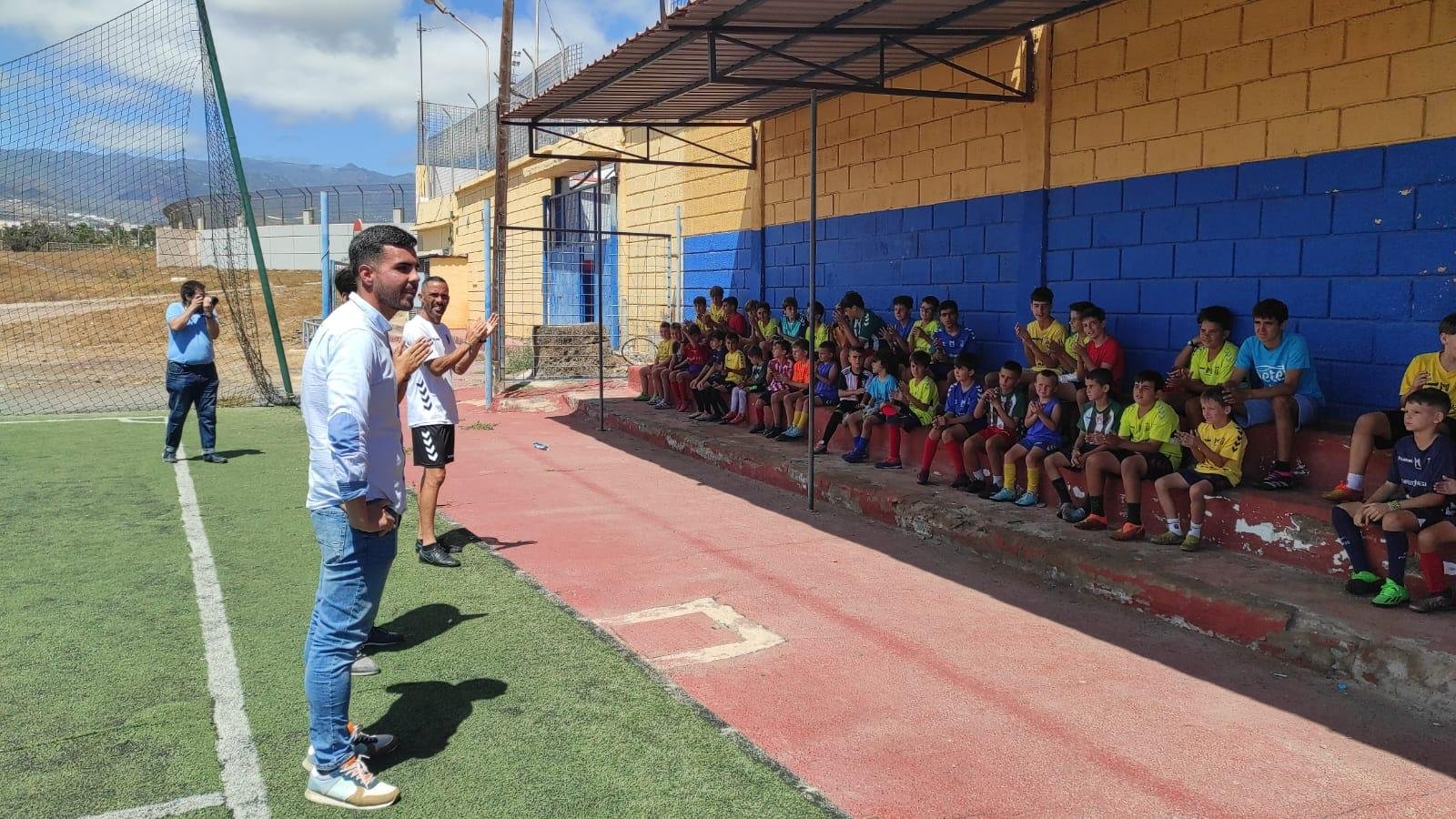 Cristhian Santana, informado de lo desarrollado en este campamento futbolístico, pudo observar los preparativos de una yincana que, tras la salutación del regidor de Deportes a los integrantes del mismo, realizarían por el entorno del Estadio El Hornillo.