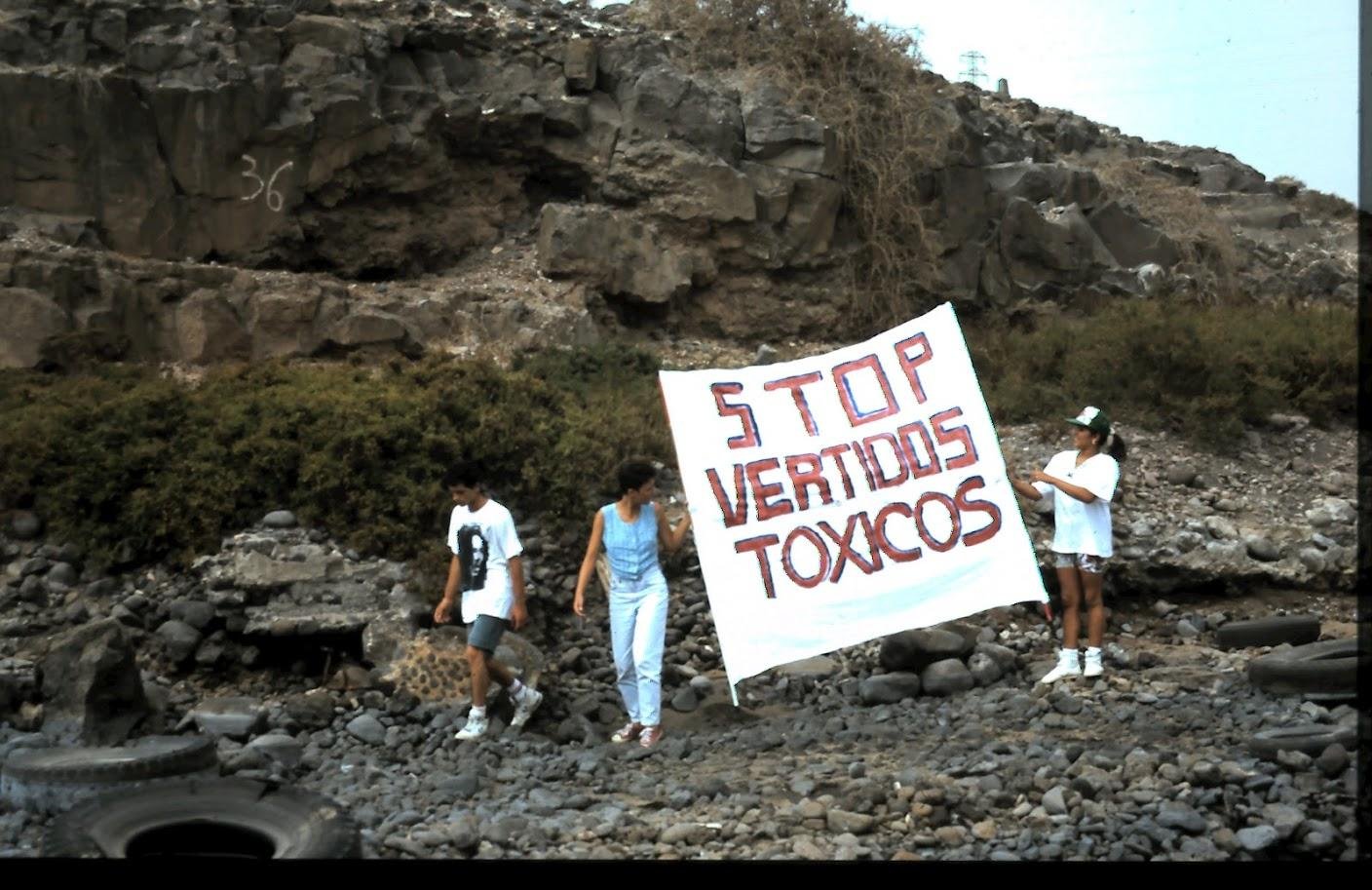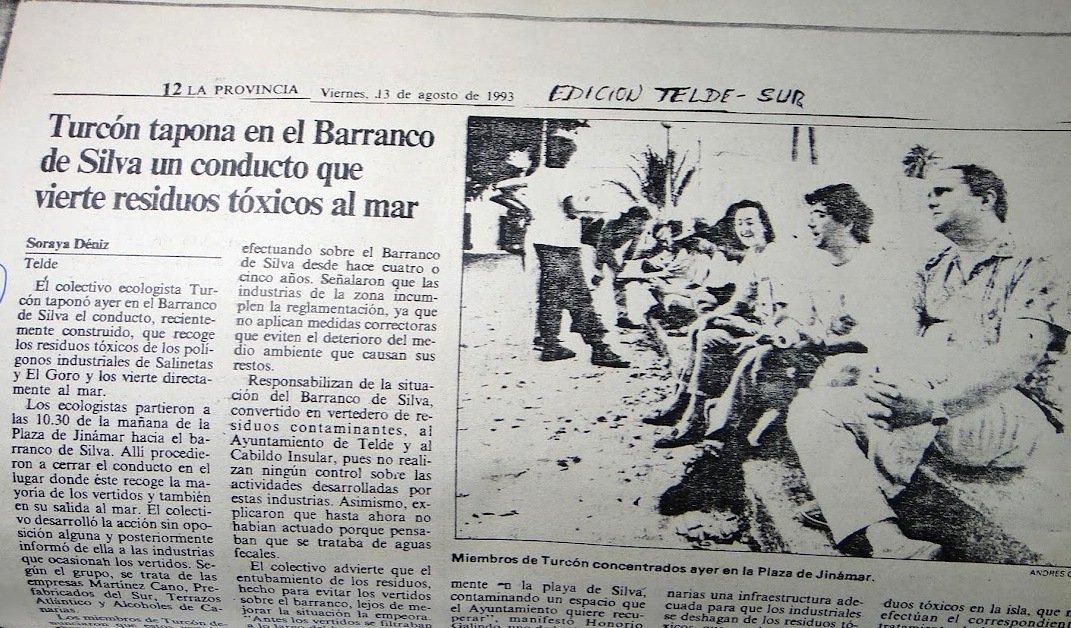 «El colectivo ecologista Turcón taponó ayer en el Barranco de Silva, el conducto recientemente construido que recoge los residuos tóxicos de los polígonos industriales de El Goro y Salinetas y los vierte directamente al mar».