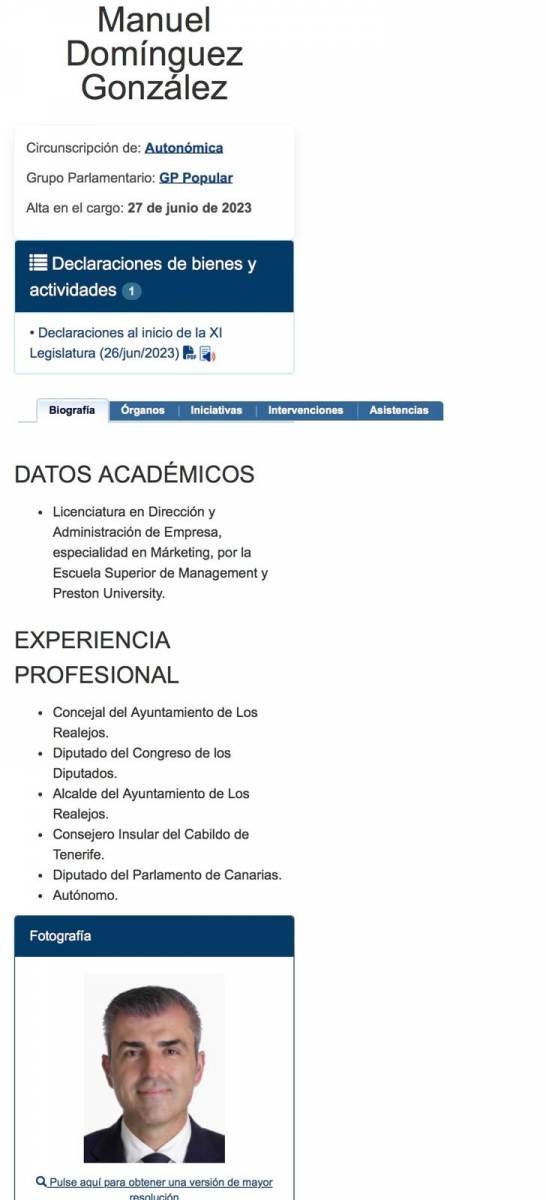 Y ahora toca mirar al actual presidente del PP en Canarias y vicepresidente del Gobierno autonómico, Manuel Domínguez González. Según su perfil institucional, ostenta una Licenciatura en Dirección y Administración de Empresas, especialidad en Marketing, por la Escuela Superior de Management, y un MBA por la Universidad de Wyoming.