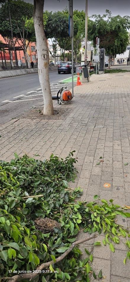Honorio Galindo Rocha, miembro de la Plataforma Salvar Chira-Soria, con el cargo de vicepresidente de la misma, denuncia que «al dirigirme a mi vivienda y pasar junto al negocio conocido Autos Volvo que viene a quedar junto a la Avenida del Cabildo insular, y a la altura aproximada de la calle P. Diego Cambreleng Mesa, me encuentro con que están ejecutando la mal llamada “poda” de los árboles en la vía pública».