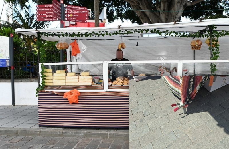 En las pasadas fiestas de San Juan, todos los puestos de artesanía- por cierto una pobre feria de artesanía- tenían protectores de goma en las patas para no dañar el adoquinado, menos un puesto de pan y dulces de al menos 8 metros de largo, que sostenía todo el peso del mismo sin ninguna protección, y adjuntamos foto donde puede comprobarse.