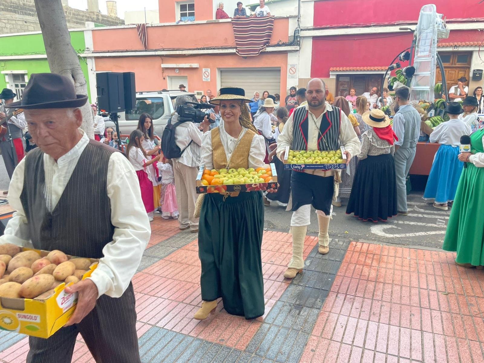 Los vecinos y vecinas de El Calero han peregrinado este sábado por las calles de este popular barrio teldense hasta las puertas de la Iglesia donde les espera su patrona, Nuestra Señora de Fátima, para recibir la suculenta ofrenda que todas las carretas han querido cargar y acercarse, para con este gesto, ofrecer ante la virgen su compromiso y solidaridad con aquellos que peor lo pasan en estos tiempos. A través de la Parroquia de Nuestra señora de Fátima estas ofrendas serán distribuidas entre aquellos que más lo necesitan.