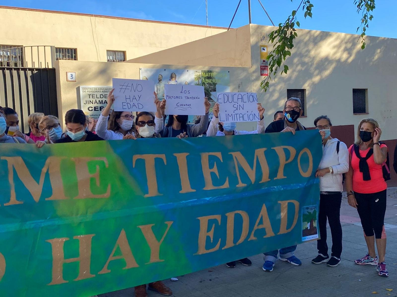 El equipo docente y el alumnado del Centro de Adultos de Jinámar (Telde), se han concentrado en la puerta del centro, reclamando que no se lleve a cabo la medida que intenta implantar la Consejería de Educación del Gobierno de Canarias, de imponer un tope de cuatro cursos para la permanencia de los mayores en dichos Centro educativo.