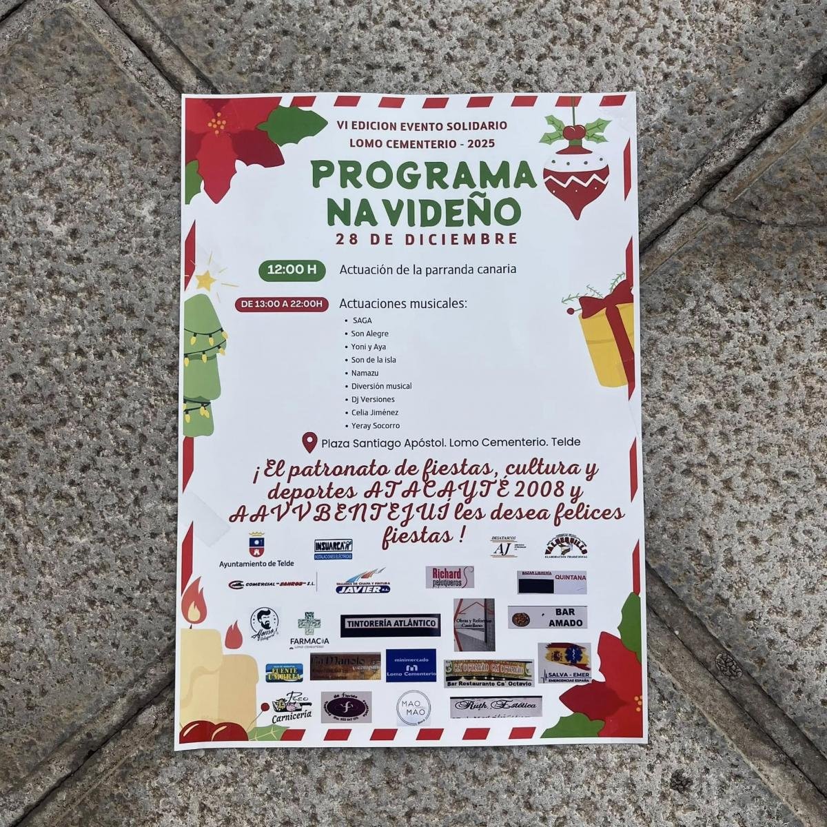 El barrio de Lomo Cementerio en Telde acoge este sábado 28 de diciembre un acto solidario para recaudar alimentos y juguetes durante las épocas navideñas, una iniciativa organizada por el Patronato Atacayte 2008, junto con la Parroquia De Santiago Apostol, la AAVV Bentejuí y la colaboración del Ayuntamiento de Telde. El evento arrancará a las 10:00 horas y contará con exhibiciones, música, juegos, talleres y actividades infantiles, además de pasacalles y conciertos durante toda la jornada».