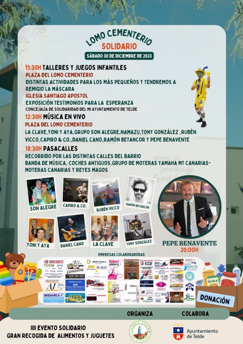 Lomo Cementerio acogerá el próximo 30 de diciembre una acto solidario para recaudar alimentos y juguetes durante las épocas navideñas, una iniciativa organizada por el patronato de fiestas Atacayte con la colaboración del Ayuntamiento de Telde. El evento arrancará a las 11.30 horas y habrá exhibiciones, música, juegos, talleres y actividades infantiles, además de pasacalles y conciertos durante toda la jornada.