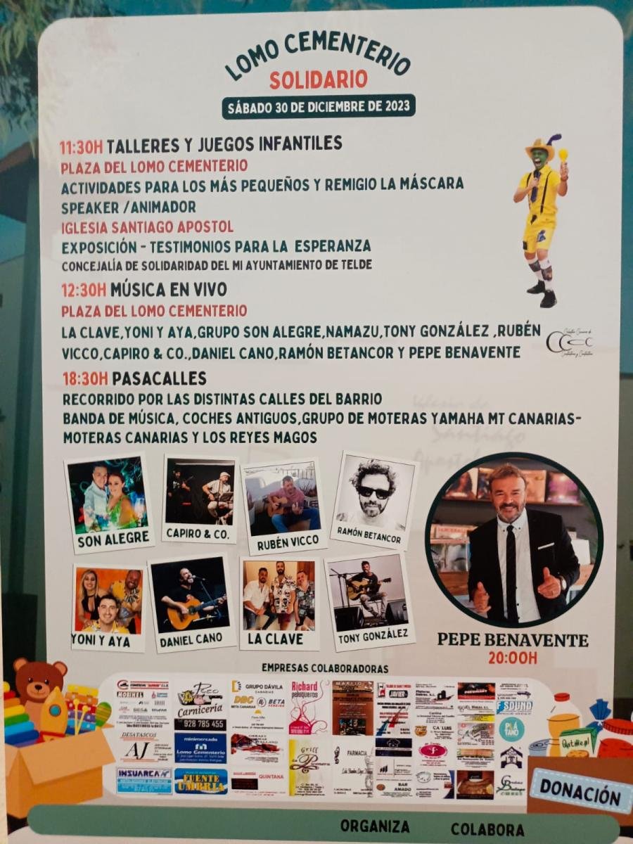 Lomo Cementerio acogerá el próximo 30 de diciembre una acto solidario para recaudar alimentos y juguetes durante las épocas navideñas, una iniciativa organizada por el patronato de fiestas Atacayte con la colaboración del Ayuntamiento de Telde. El evento arrancará a las 11.30 horas y habrá exhibiciones, música, juegos, talleres y actividades infantiles, además de pasacalles y conciertos durante toda la jornada.