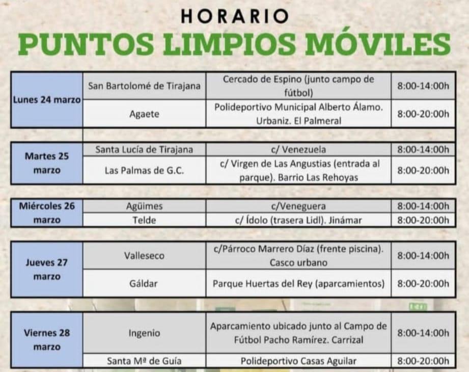El Punto Limpio Itinerante del Cabildo de Gran Canaria vuelve a Telde este miércoles, 26 de marzo, concretamente al barrio de Jinámar. La Concejalía de Limpieza Viaria y Recogida de Residuos Sólidos, que dirige María Calderín, ubicará el contenedor de reciclaje en la calle Ídolo (trasera del Lidl), en horario de 8.00 a 20.00 horas. Además, será instalado un contenedor metálico adicional para la recogida de residuos limpios de construcción y demolición de obras menores, excepto si son de empresas.
