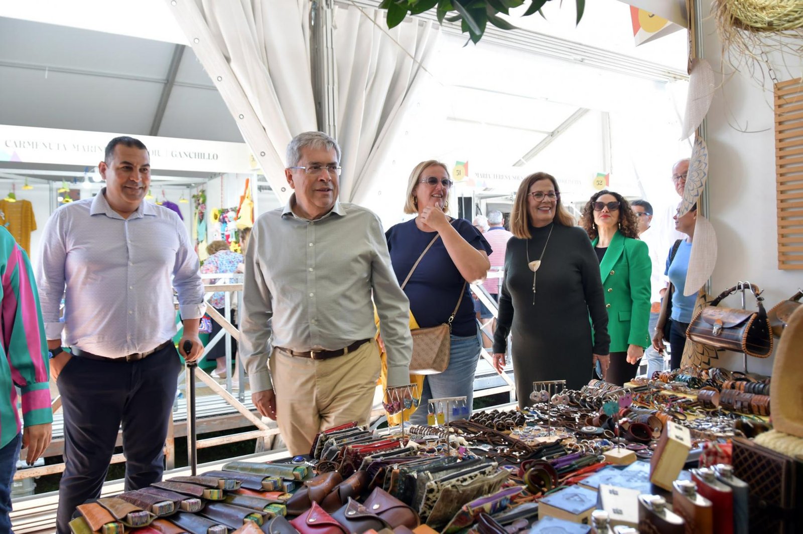 La consejera de Desarrollo Económico, Industria, Comercio y Artesanía del Cabildo de Gran Canaria, Minerva Alonso, acompañada del alcalde del Ayuntamiento de San Bartolomé de Tirajana, Marco Aurelio Pérez, la directora gerente de la Fedac, Águeda Hernández, y la directora general de Infecar, Feria de Gran Canaria, Natalia Santana, ha recorrido cada uno de los estands presentes en esta cita, dándoles la bienvenida a esta edición y conociendo de primera mano sus piezas.