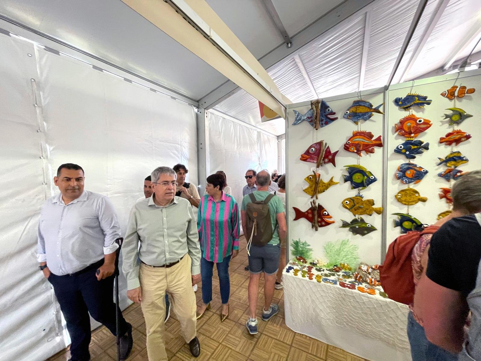 La consejera de Desarrollo Económico, Industria, Comercio y Artesanía del Cabildo de Gran Canaria, Minerva Alonso, acompañada del alcalde del Ayuntamiento de San Bartolomé de Tirajana, Marco Aurelio Pérez, la directora gerente de la Fedac, Águeda Hernández, y la directora general de Infecar, Feria de Gran Canaria, Natalia Santana, ha recorrido cada uno de los estands presentes en esta cita, dándoles la bienvenida a esta edición y conociendo de primera mano sus piezas.