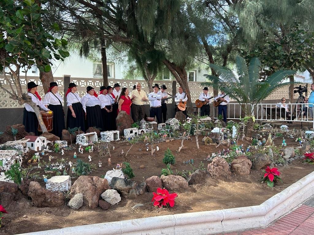 Este mediodía se inauguró el nacimiento canario al aire libre montado con material reutilizado en el espacio ajardinado público de la calle de Palmera, en La Garita, por el Patronato de Fiestas La Sal que dirige hace décadas Julia Martel.