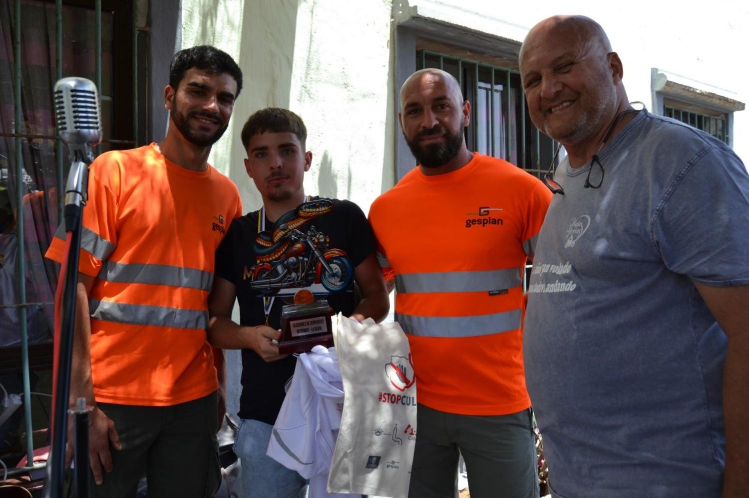 Las motos se exhibieron en el local social, donde se presentaron las mejoras y transformaciones para el concurso. El ganador oficial fue Diego de Arucas, con su FDS y una imagen muy lograda. Otros amigos lo acompañaron en la foto oficial, recordando ediciones anteriores. Mientras, el local social se transformó en una sala de fotografías antiguas, con imágenes de la gente del barrio en los sesenta y del primer enducross de los noventa, evocando nuestro pasado juvenil.