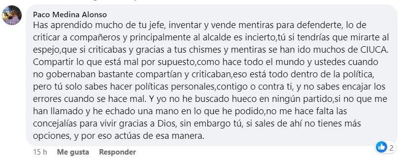 El hoy activista social, Paco Medina, no se amedrentó ni mucho menos, espetándole a Jacinta que “has aprendido mucho de tu jefe, inventar y vender mentiras para defenderte, lo de criticar a compañeros y principalmente al alcalde es incierto, tú si tendrías que mirarte al espejo que si criticabas y gracias a tus chismes y mentiras se han ido muchos de CIUCA. Compartir lo que está mal por supuesto, como hace todo el mundo y ustedes cuando no gobernaban bastante compartían y criticaban, eso está todo dentro de la política, pero tú solo sabes hacer políticas personales, contigo o contra ti, y no sabes encajar los errores cuando se hace mal. Y yo no he buscado hueco en ningún partido, si no que me han llamado y he echado una mano en lo que he podido, no me hace falta las concejalías para vivir gracias a Dios, sin embargo, tú, si sales de ahí no tienes más opciones, y por eso actúas de esa manera”.