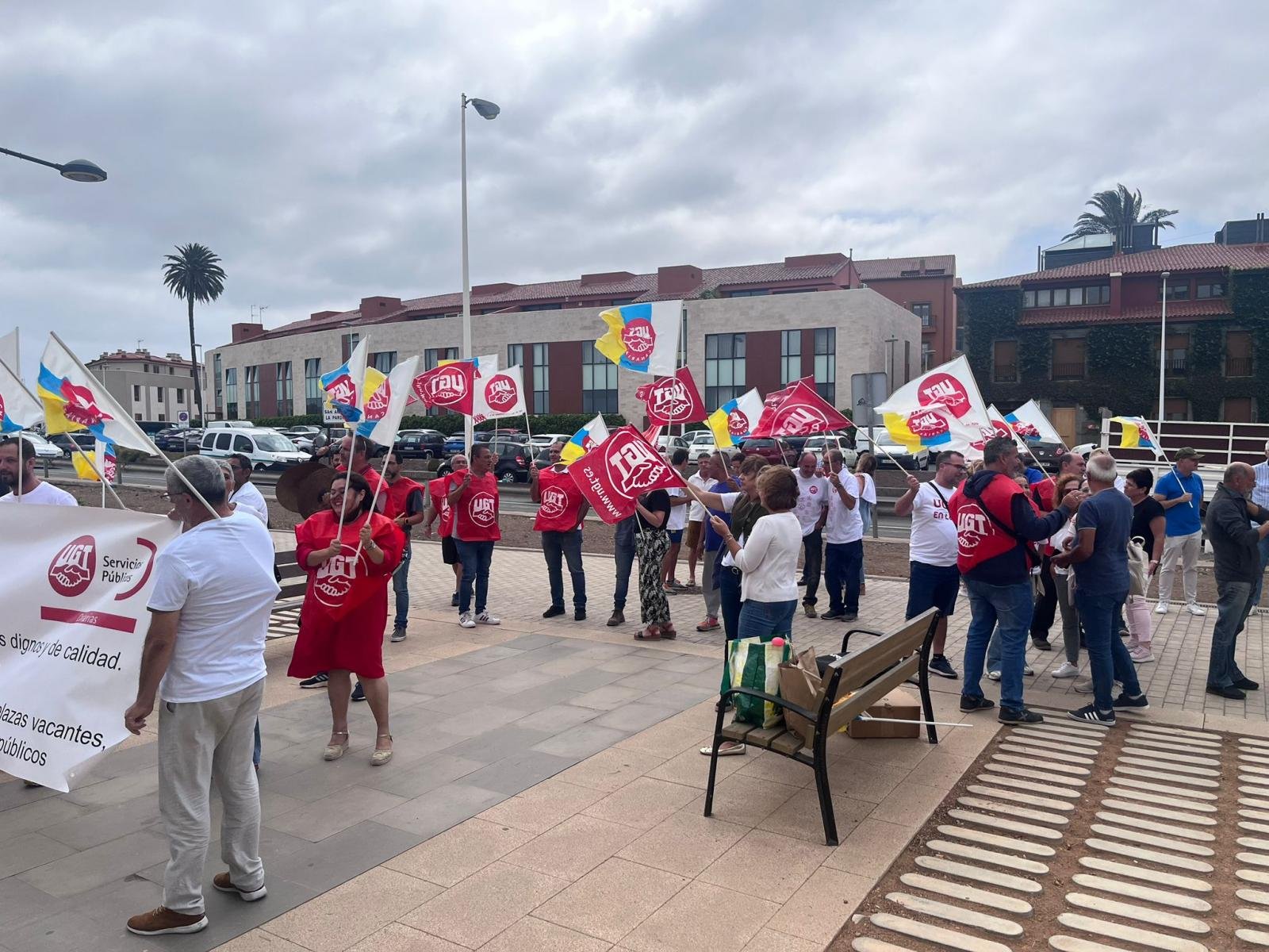 UGT con el apoyo de Intersindical Canaria llevó a cabo este miércoles la primera de las concentraciones frente al Ayuntamiento de Telde convocada para reclamar la recuperación de ciertos derechos laborales que los trabajadores municipales han visto recortados en los últimos años.