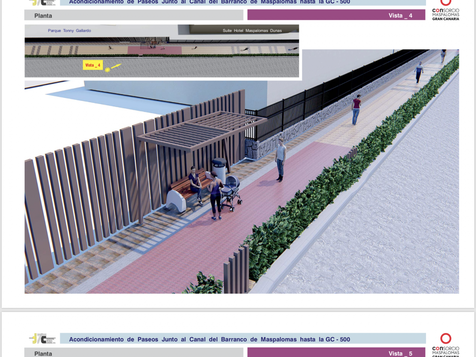 Recuperar los márgenes del Barranco de Maspalomas para su conversión en dos paseos homogéneos y modernos, dotados con carriles bici y peatonal habilitados para el paseo y la práctica deportiva, con diversas zonas confortables de sombra y descanso, conllevará una importante actuación de reposición y cambio en los firmes y escalinatas, en el sistema de alumbrado, los vallados del cauce, los dos puentes que lo atraviesan, el cerramiento exterior de los complejos turísticos y residenciales de la zona, y también en la cuidadosa reforestación vegetal y arbórea que habrá que ejecutar en la misma.