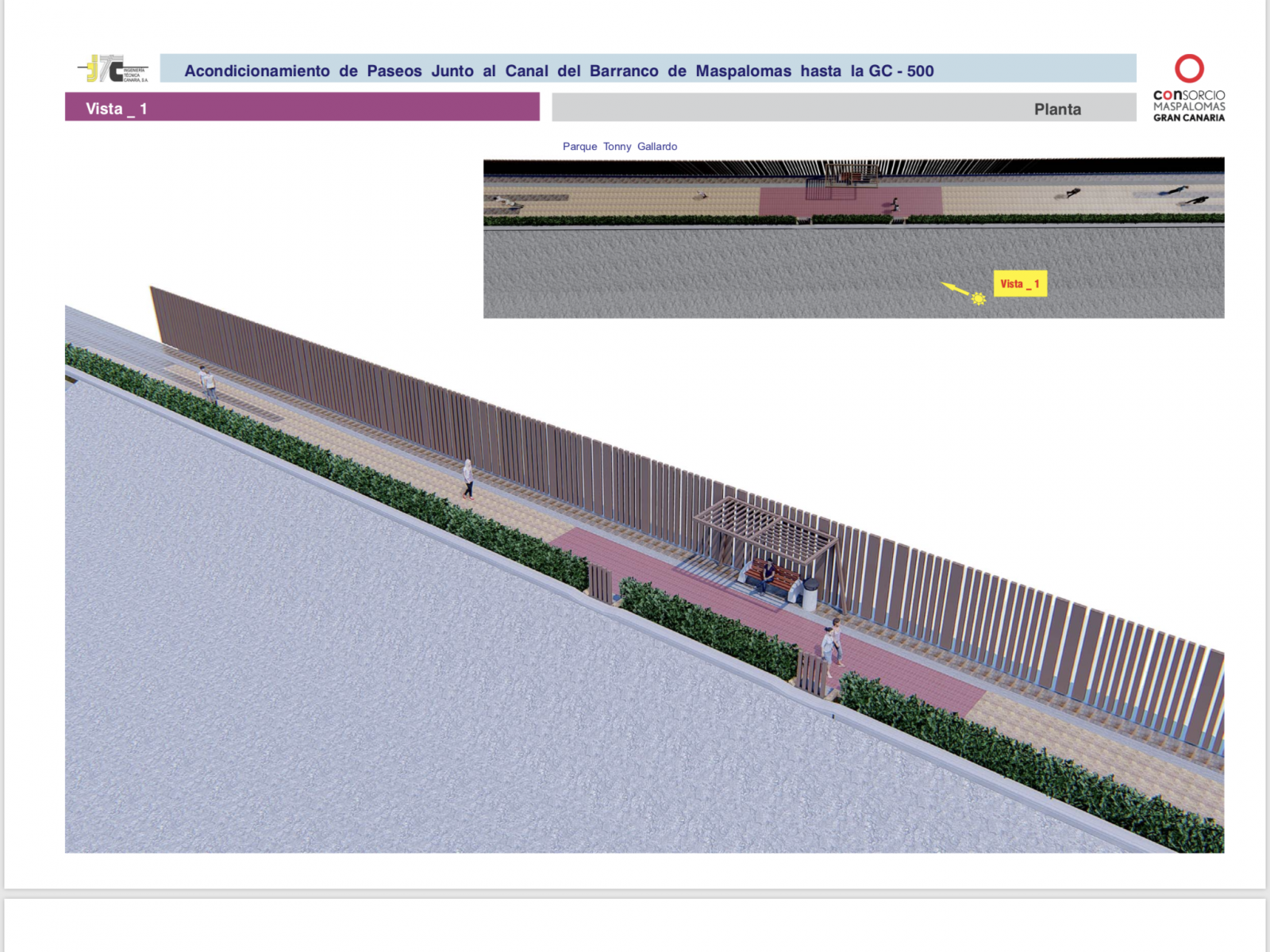 Recuperar los márgenes del Barranco de Maspalomas para su conversión en dos paseos homogéneos y modernos, dotados con carriles bici y peatonal habilitados para el paseo y la práctica deportiva, con diversas zonas confortables de sombra y descanso, conllevará una importante actuación de reposición y cambio en los firmes y escalinatas, en el sistema de alumbrado, los vallados del cauce, los dos puentes que lo atraviesan, el cerramiento exterior de los complejos turísticos y residenciales de la zona, y también en la cuidadosa reforestación vegetal y arbórea que habrá que ejecutar en la misma.