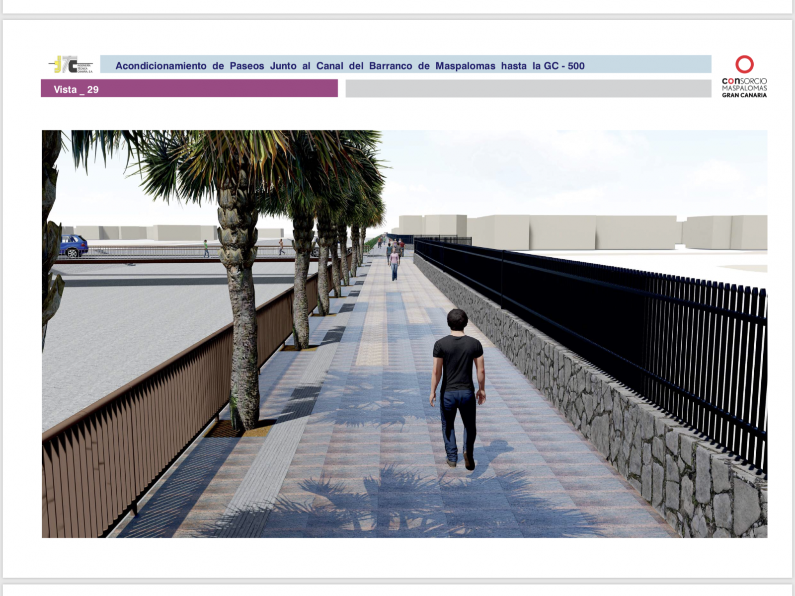 Recuperar los márgenes del Barranco de Maspalomas para su conversión en dos paseos homogéneos y modernos, dotados con carriles bici y peatonal habilitados para el paseo y la práctica deportiva, con diversas zonas confortables de sombra y descanso, conllevará una importante actuación de reposición y cambio en los firmes y escalinatas, en el sistema de alumbrado, los vallados del cauce, los dos puentes que lo atraviesan, el cerramiento exterior de los complejos turísticos y residenciales de la zona, y también en la cuidadosa reforestación vegetal y arbórea que habrá que ejecutar en la misma.
