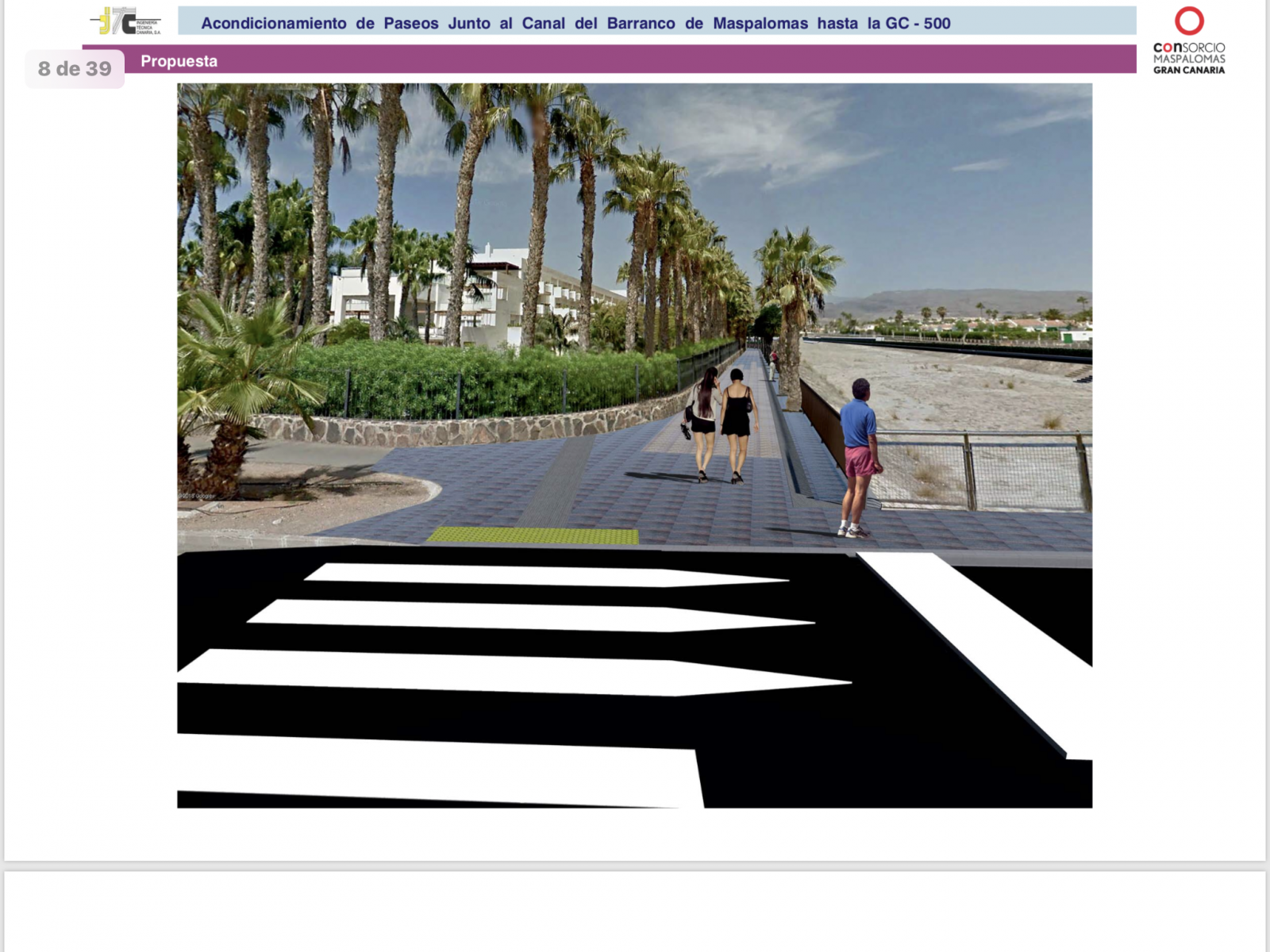 Recuperar los márgenes del Barranco de Maspalomas para su conversión en dos paseos homogéneos y modernos, dotados con carriles bici y peatonal habilitados para el paseo y la práctica deportiva, con diversas zonas confortables de sombra y descanso, conllevará una importante actuación de reposición y cambio en los firmes y escalinatas, en el sistema de alumbrado, los vallados del cauce, los dos puentes que lo atraviesan, el cerramiento exterior de los complejos turísticos y residenciales de la zona, y también en la cuidadosa reforestación vegetal y arbórea que habrá que ejecutar en la misma.