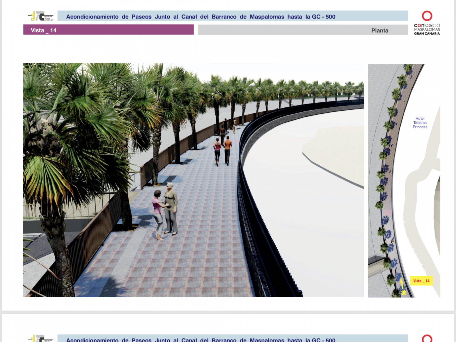 Recuperar los márgenes del Barranco de Maspalomas para su conversión en dos paseos homogéneos y modernos, dotados con carriles bici y peatonal habilitados para el paseo y la práctica deportiva, con diversas zonas confortables de sombra y descanso, conllevará una importante actuación de reposición y cambio en los firmes y escalinatas, en el sistema de alumbrado, los vallados del cauce, los dos puentes que lo atraviesan, el cerramiento exterior de los complejos turísticos y residenciales de la zona, y también en la cuidadosa reforestación vegetal y arbórea que habrá que ejecutar en la misma.