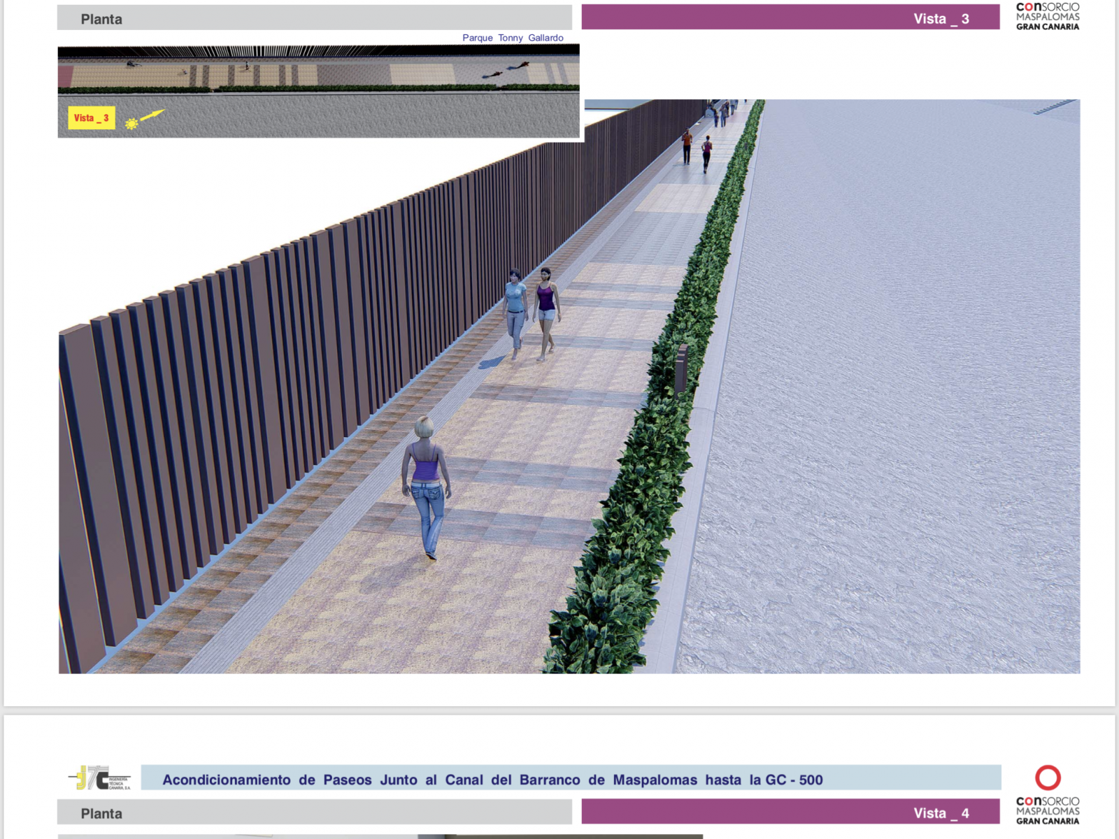Recuperar los márgenes del Barranco de Maspalomas para su conversión en dos paseos homogéneos y modernos, dotados con carriles bici y peatonal habilitados para el paseo y la práctica deportiva, con diversas zonas confortables de sombra y descanso, conllevará una importante actuación de reposición y cambio en los firmes y escalinatas, en el sistema de alumbrado, los vallados del cauce, los dos puentes que lo atraviesan, el cerramiento exterior de los complejos turísticos y residenciales de la zona, y también en la cuidadosa reforestación vegetal y arbórea que habrá que ejecutar en la misma.