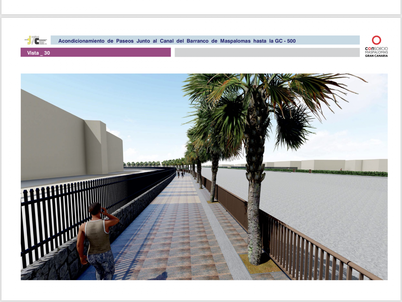 Recuperar los márgenes del Barranco de Maspalomas para su conversión en dos paseos homogéneos y modernos, dotados con carriles bici y peatonal habilitados para el paseo y la práctica deportiva, con diversas zonas confortables de sombra y descanso, conllevará una importante actuación de reposición y cambio en los firmes y escalinatas, en el sistema de alumbrado, los vallados del cauce, los dos puentes que lo atraviesan, el cerramiento exterior de los complejos turísticos y residenciales de la zona, y también en la cuidadosa reforestación vegetal y arbórea que habrá que ejecutar en la misma.