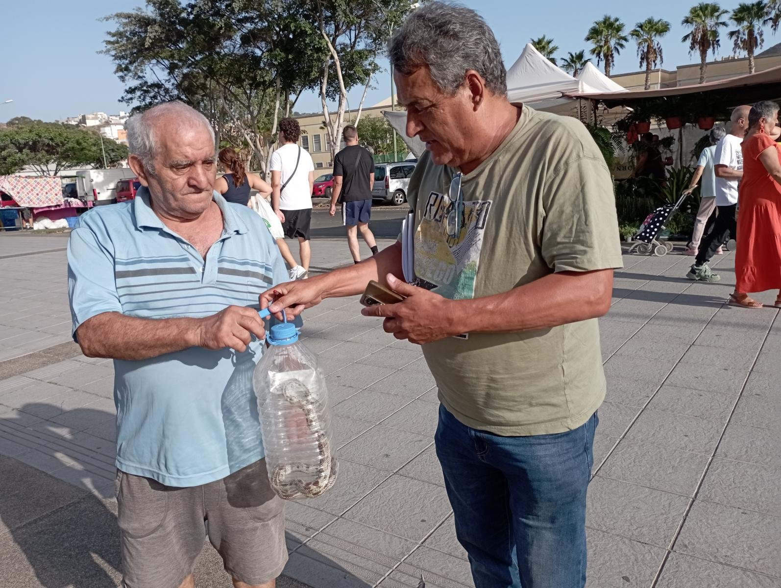 Tranquilo (le contesto) ahora buscamos a Viñoly que está por ahí y se la damos a él, es funcionario municipal, está a cargo del Mercadillo y él sabrá cómo solucionarlo. Mientras íbamos en busca de Viñoly la gente se agolpaba en torno a nosotros curioseando y mirando a «la bicha» paseando en la garrafa. Algunos decían: pobre animalito échenle algo de comer…un trozo de pan o algo. Ya con la retranca canariona otras-os si hombre con mantequilla» para concluir con otro que nos decía «déjense de miserias y denle un trozo de solomillo que estos son carnívoros»