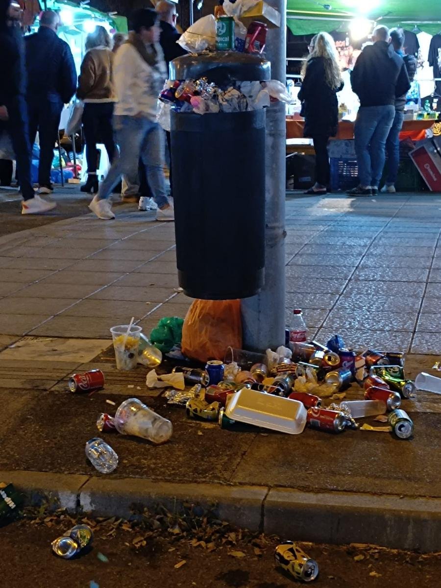 Otra de las tantas necesidades de esa noche estaba en vaciar las papeleras de todo el recinto para evitar imágenes tan desagradables como ver las mismas rebosantes de basura y ver  el suelo a su alrededor que no les cabían más. Además de no tener controlado cada puesto para que recogieran su basura, ya que una vez terminado el mercadillo, recogieron todo dejando los puestos llenos de basura.