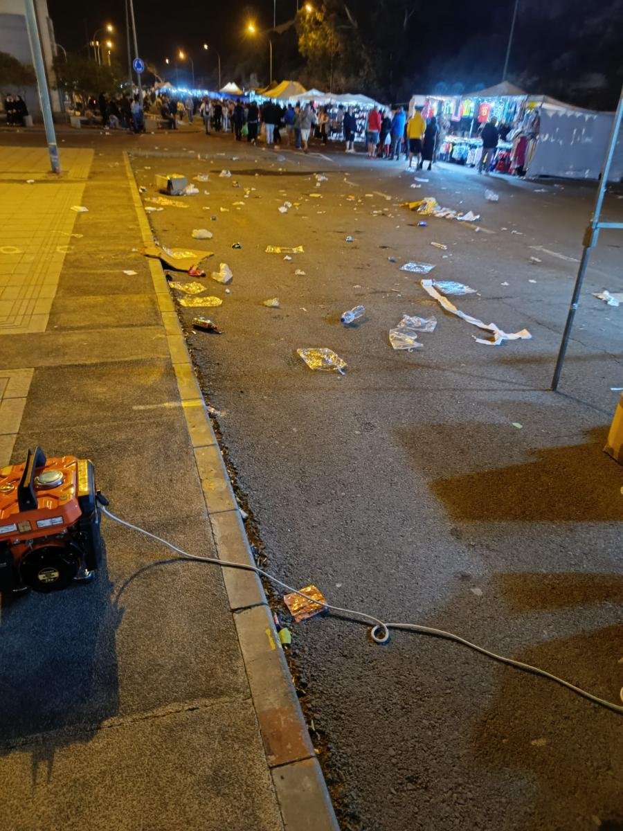 Otra de las tantas necesidades de esa noche estaba en vaciar las papeleras de todo el recinto para evitar imágenes tan desagradables como ver las mismas rebosantes de basura y ver  el suelo a su alrededor que no les cabían más. Además de no tener controlado cada puesto para que recogieran su basura, ya que una vez terminado el mercadillo, recogieron todo dejando los puestos llenos de basura.
