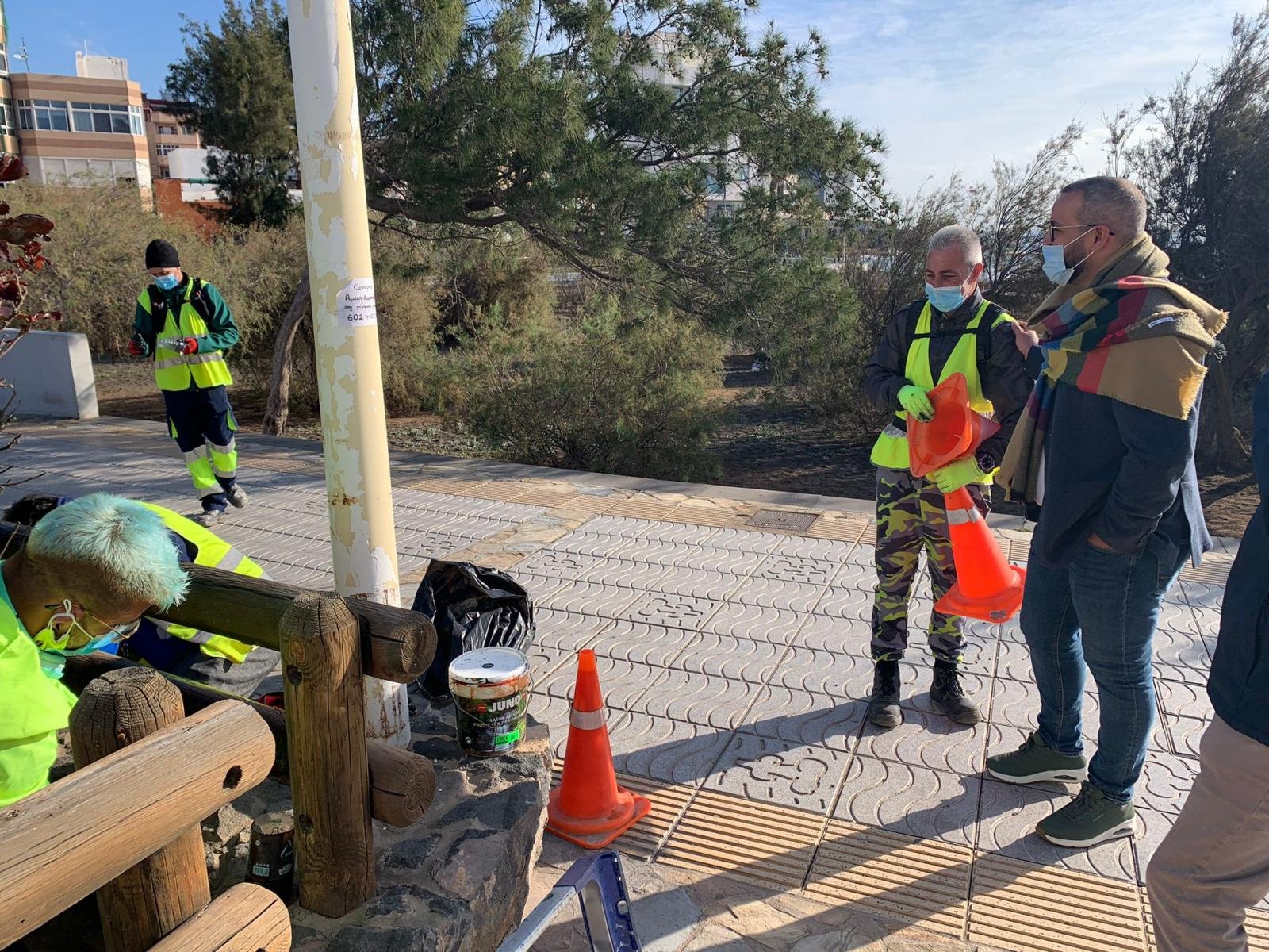 Jonay López, que visitó las playas este martes junto a personal de la Concejalía para comprobar el desarrollo de los trabajos, afirma que “es destacable el cambio que ya puede percibirse tanto en Hoya del Pozo, -con un nuevo muro, el puente restaurado y la zona de jardín limpia y reorganizada-, así como en La Garita, en donde se trabaja para renovar el frontal de la avenida marítima lijando y pintando el vallado de madera”.