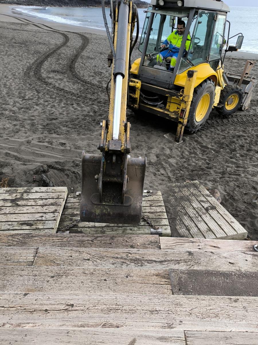 El tractor de Servicios Municipales y los operarios pudieron retirar los restos y colocar las nuevas plataformas que permitirán la entrada segura a la cala, en especial a personas con movilidad reducida.
