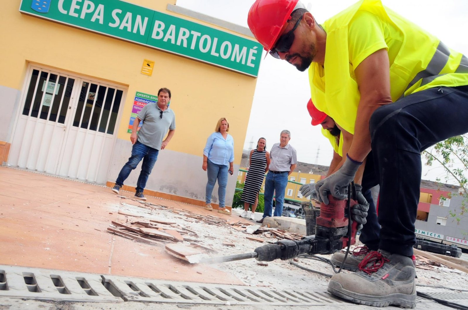 El alcalde de San Bartolomé de Tirajana, Marco Aurelio Pérez Sánchez, ha supervisado este viernes junto a la segunda teniente de alcalde, Elena Álamo Vega, y la concejala de Educación, Esther Delgado Sánchez, algunos de los trabajos de reparación y mejora que el Ayuntamiento está realizando en estos momentos en una docena de centros educativos del municipio.