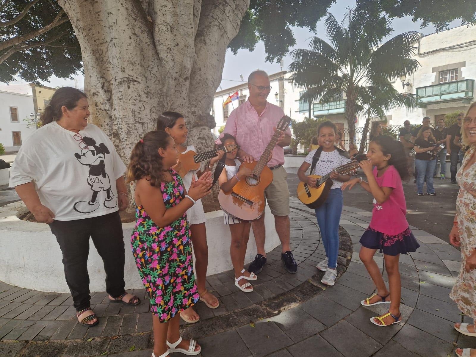 El recibimiento comenzó en la plaza de San Juan, a los pies de las Casas Consistoriales, donde la Escuela Municipal de Folclore y la Banda Municipal de Música interpretaron tres canciones cada una, para amenizar el acto.