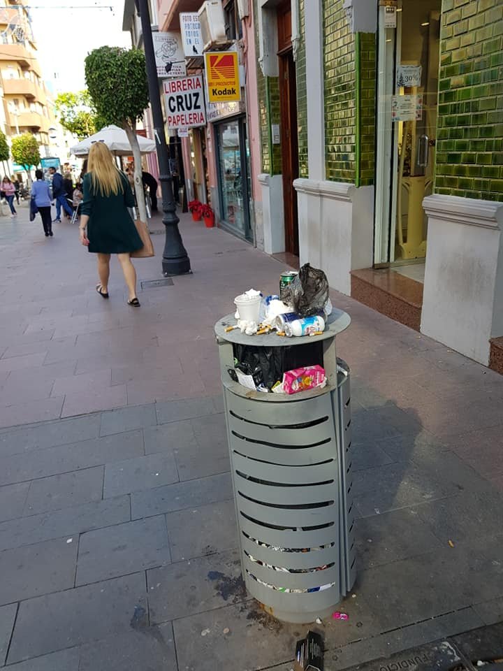 Las papeleras rebosando de basura es la sucia imagen que viene dando en Navidad la Zona comercial abierta de San Gregorio y el área polivalente, en Los Picachos.