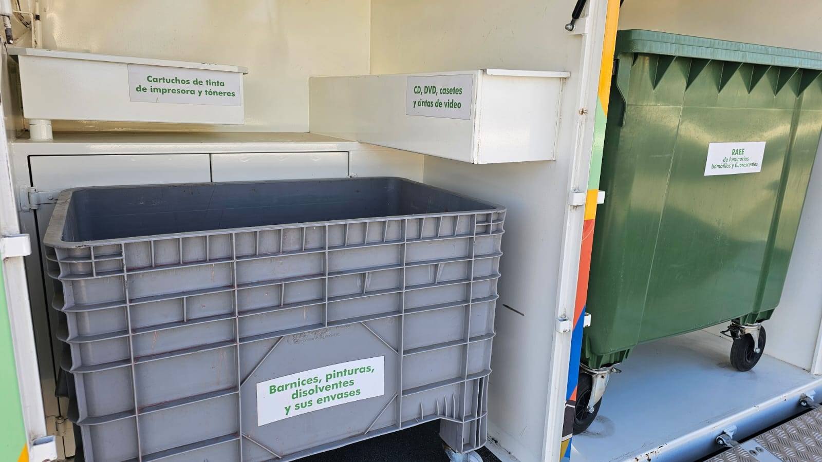 En detalle, en el punto limpio itinerante se pueden depositar -en sus compartimentos correspondientes- los siguientes residuos domeìsticos: aceites de cocina usado; CD, DVD, casetes y cintas de vídeo; envases de papel y cartón, vidrio y ligeros; cartuchos de tinta y tóner de impresora; textil y calzado; radiografías; pequeños aparatos eléctricos y electrónicos; fluorescentes y bombillas de bajo consumo; barnices, pinturas, disolventes y sus envases; aerosoles; baterías de coche; pilas y baterías de móvil; cápsulas de café, tapones de plástico y gafas de sol y graduadas.