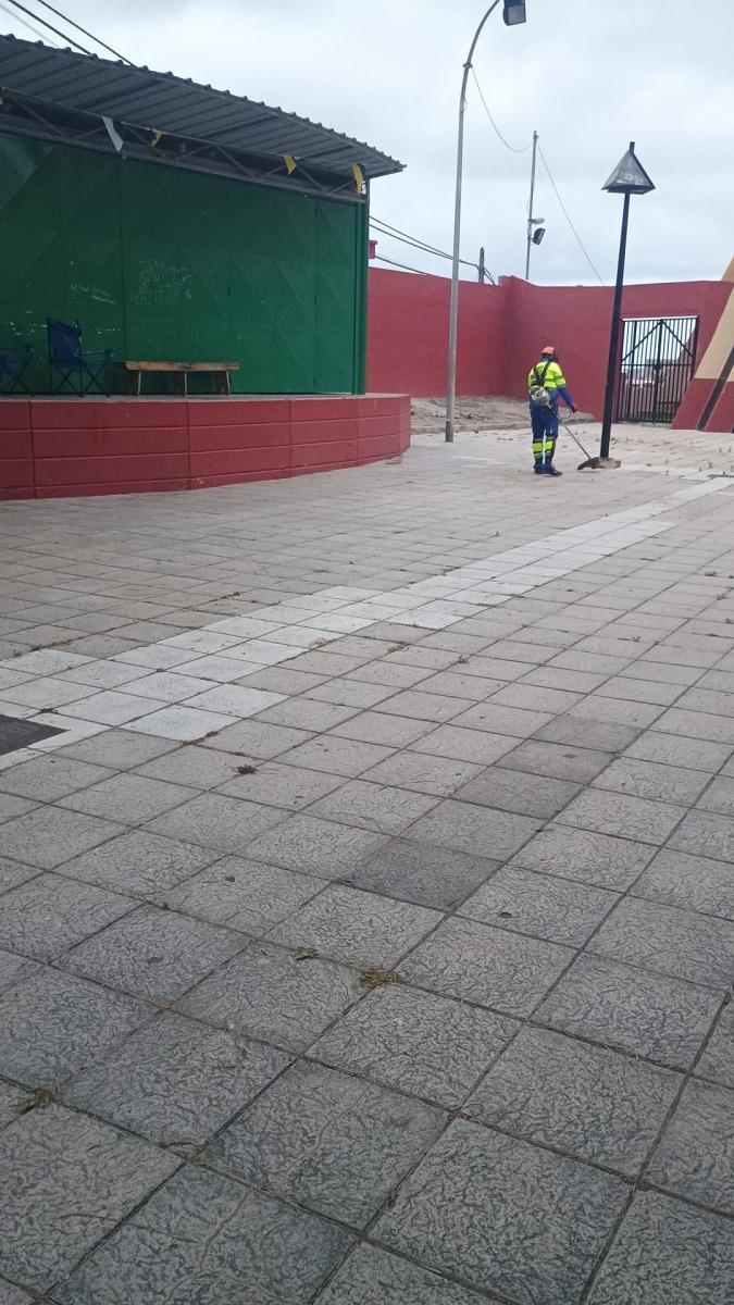 La jornada extraordinaria, de 6.00 a 13.00 horas, cuenta con un equipo de trabajo formado por 14 personas para llevar a cabo labores de baldeo mecánico y desinfección, desbroce y la reparación, limpieza y vaciado de 25 contenedores y 12 papeleras del barrio.