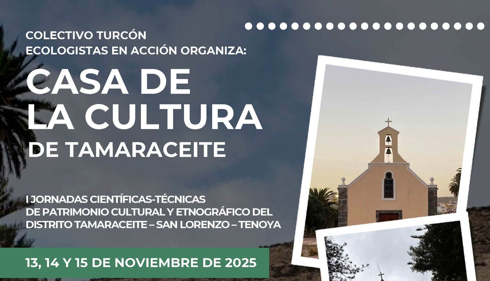 Turcón en colaboración con la facultad de Geografía e Historia de la Universidad de Las Palmas de Gran Canaria (ULPGC), y la Consejería de Presidencia del Cabildo de Gran Canaria, preparan estas Jornadas en el Distrito de Tamaraceite–San Lorenzo–Tenoya, que se celebrarán los días 13, 14 y 15 de noviembre de 2025 en la Casa de La Cultura de Tamaraceite.
