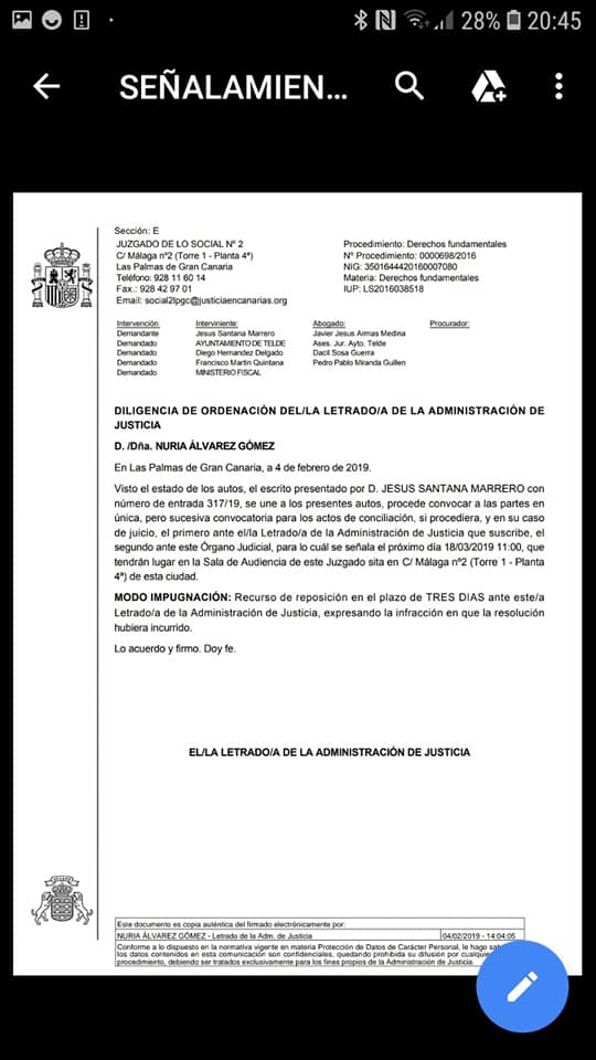 La titular del Juzgado de lo Social número 2 de la capital grancanaria, Nuria Álvarez Gómez, ha fijado para las 11.00 horas del próximo 18 de marzo (La víspera del Día del Padre) mediante una única y sucesiva convocatoria, el acto de conciliación de las partes y el juicio. El primero será ante el letrado de la Administración de Justicia y el segundo, si no hubiese acuerdo entre demandante y demandados, ante la propia magistrada.