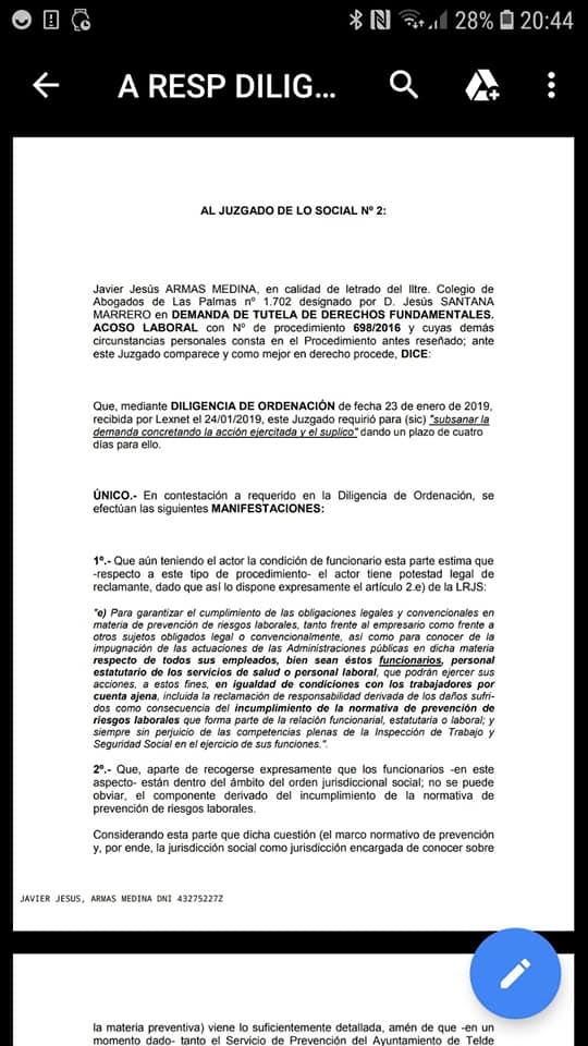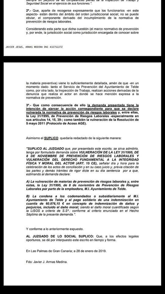 Por ello, ahora, el funcionario municipal ha interpuesto una nueva demanda ante el Juzgado de lo Social número 2 de la capital grancanaria especificando claramente que lo hace para que se declare que la Institución local ha vulnerado la normativa de prevención de riesgos laborales como también el derecho fundamental a su integridad física y moral (acoso).