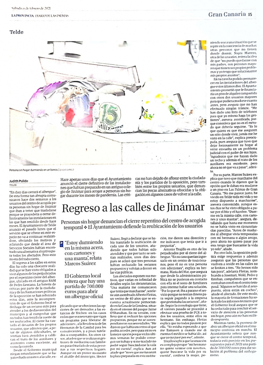 La prensa regional se hace eco de la denuncia de ONDA GUANCHE sobre la decisión del gobierno de Telde (en complicidad con el Cabildo de Gran Canaria) de dejar en la calle a 22 personas sin techo del albergue de Jinámar (en plena expansión de la tercera ola de la pandemia por Covid-19). Después de Canal4 TV ayer viernes, este sábado, es el periódico La Provincia-Dlp el que refleja esta problemática sociopolítica en un reportaje firmado por Judith Pulido y publicado en su edición impresa y digital de hoy.
