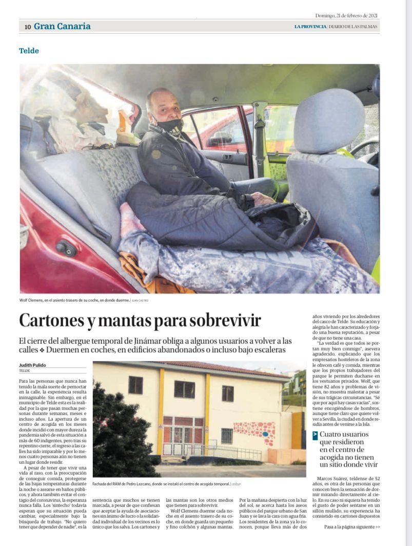 Wolf Clemens duerme cada noche en el asiento trasero de su coche, en donde guarda un pequeño y fino colchón y algunas mantas. Por la mañana despierta con la luz del sol, se acerca hasta los aseos públicos del parque urbano de San Juan y se lava la cara con agua fría. Los residentes de la zona ya lo conocen, porque lleva más de dos años viviendo por los alrededores del casco de Telde. Su educación y alegría le han caracterizado y forjado una buena reputación, a pesar de que no tiene una casa.