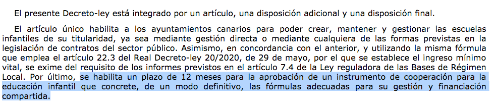 Además, “el Decreto-ley 22/2020, de 23 de diciembre, de garantía de las Escuelas Infantiles de titularidad municipal dicta que se habilita un plazo de 12 meses para la aprobación de un instrumento de cooperación para la educación infantil que concrete, de un modo definitivo, las fórmulas adecuadas para su gestión y financiación compartida y es por ello que desde ese momento y hasta la actualidad no existe ningún acuerdo con el Gobierno de Canarias y el Ayuntamiento de Telde para el sostenimiento económico, como dicta la norma”.