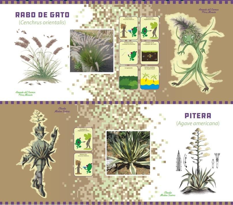 Los ilustradores se han encargado de personificar estos ‘monstruos’, como es el caso de la tunera india y la común, la caña común, la uña de gato, el tabaco moro, la palmera datilera, el rabo de gato y la pitera, entre otras especies.