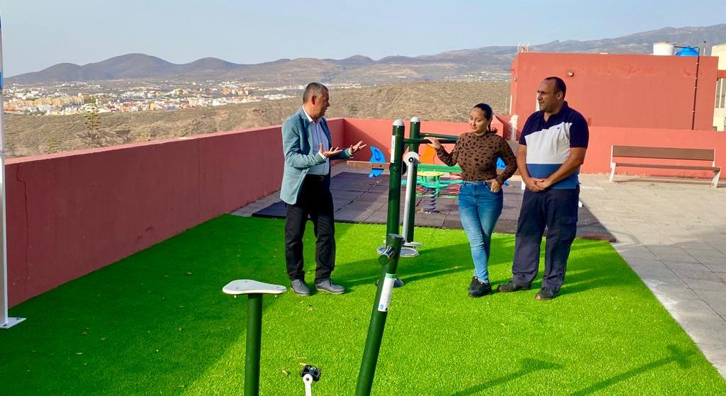 El edil estuvo acompañado por Marcos Alemán y Carolina Martín, miembros de la asociación vecinal Nuestra Señora del Pilar de Caserones Altos, entidad que solicitaba la instalación de estos juegos. Ambos mostraron su agradecimiento al concejal por cumplir con el compromiso de esta demanda que reclamaban hace años.