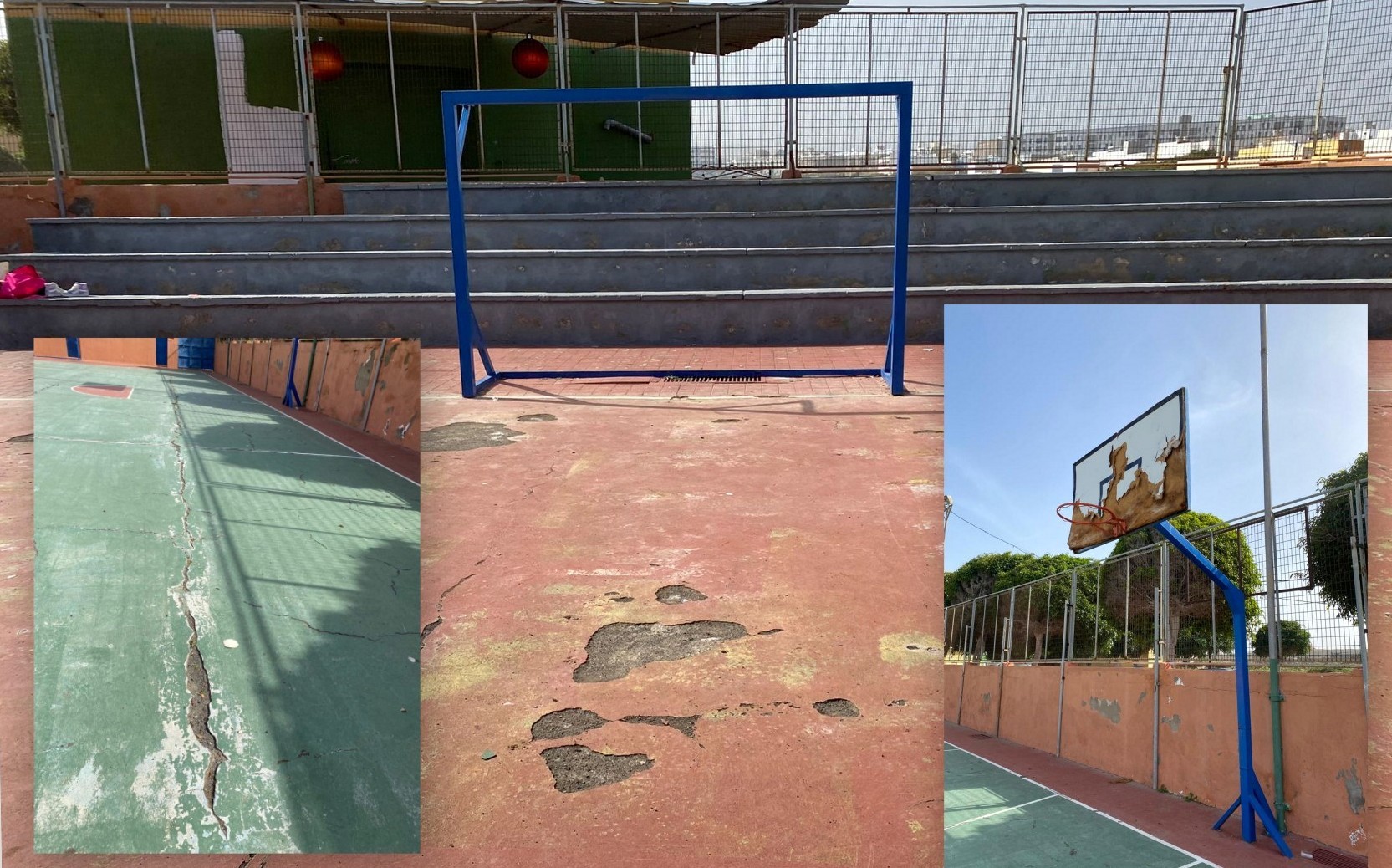En muchas de las canchas el pavimento está completamente deteriorado, el vallado perimetral de protección roto, canastas y porterías oxidadas, canastas sin red. Es peligroso mantener las áreas deportivas abandonadas en estas circunstancias. No se entiende que al gobierno de Telde no le importe que sean utilizadas a pesar de la inseguridad que existe.