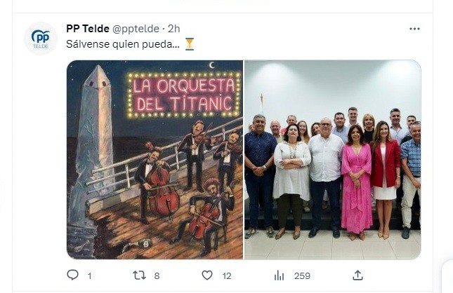 «Sálvese quien pueda», con esta contundencia se muestra el Partido Popular de Telde en su perfil oficial de Twitter, tras conocer la composición de la lista electoral de Nueva Canarias en Telde. El partido de la gaviota refrenda de esta manera el sentir generalizado de la ciudadanía teldense al conocer la composición de la lista de candidatos de los nacionalistas para el próximo 28 de mayo. Para ello, los populares ilustraban la información de su cuenta oficial con una composición fotográfica que incluía un dibujo de los músicos del Titanic tocando mientras se hundía el barco, combinada con la foto de la lista electoral de NC en Telde y un emoticono de reloj de arena, en clara alusión a la cuenta atrás que le queda a los nacionalistas para abandonar el poder. El mensaje del PP es claro: «NC se hunde en Telde».