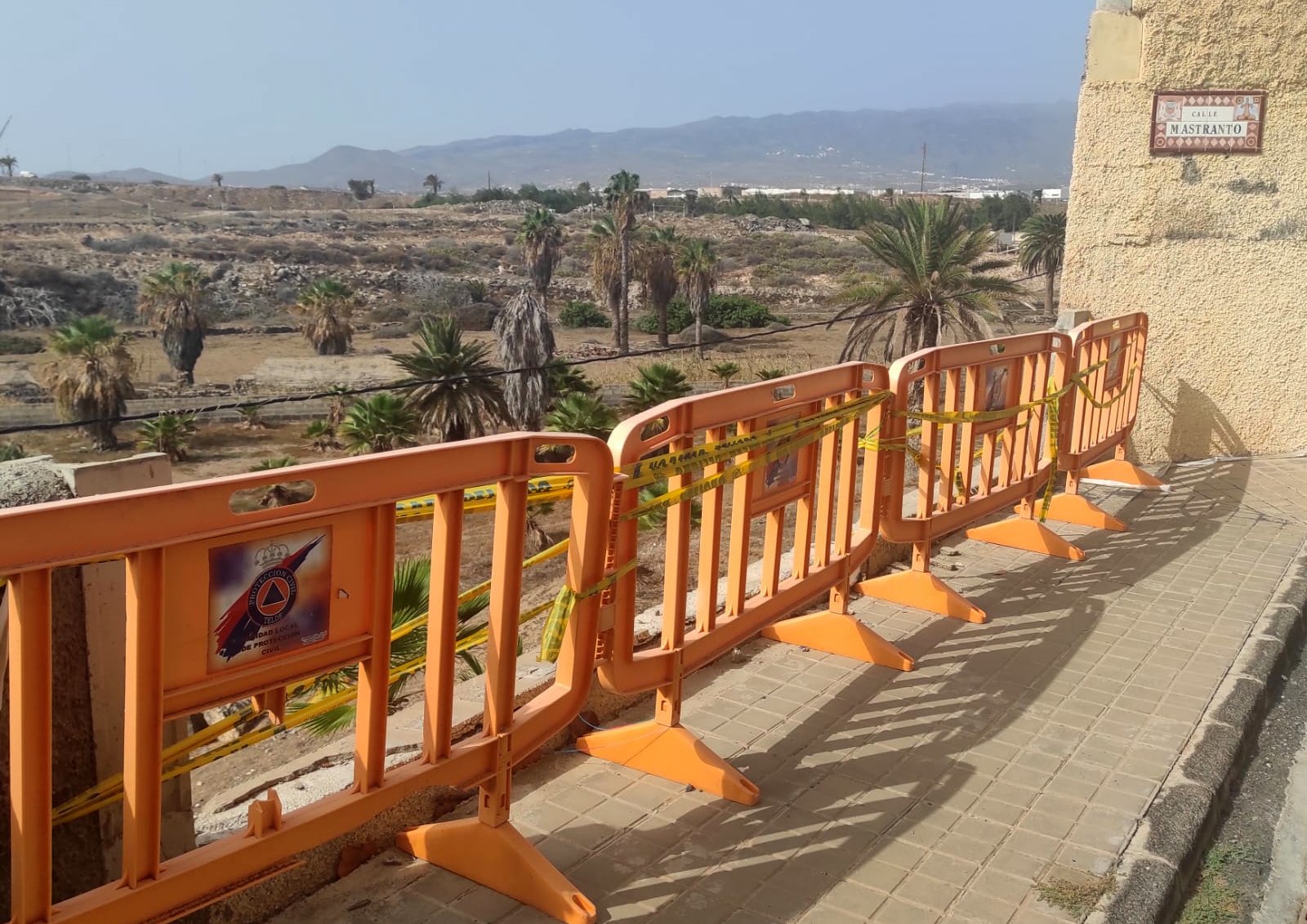 Un muro se ha desprendido en la calle Mastranto de Hoya del Pozo (Telde) y solo unas vallas plásticas que el viento puede arrastrar en cualquier momento protegen la caída de cualquier transeúnte de una altura considerable de más de doce metros. Los vecinos solicitan la pronta reparación del mismo para evitar una desgracia.