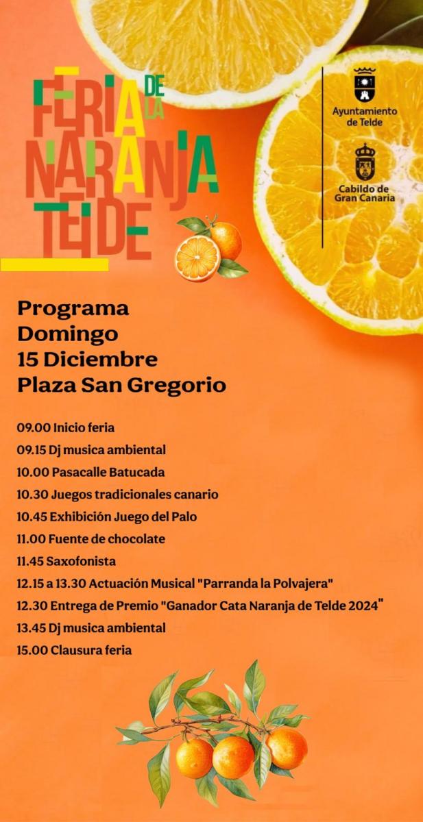 De 12.15 a 13.30 horas será el turno de la Parranda la Polvajera con una actuación musical. Para poner el colofón al evento, a partir de las 12.30 horas, se realizará la entrega de premios de la Cata de Naranjas de Telde 2024, momento en el que se dará a conocer las tres mejores naranjas de la ciudad. La clausura de la edición será a las 15.00 horas.