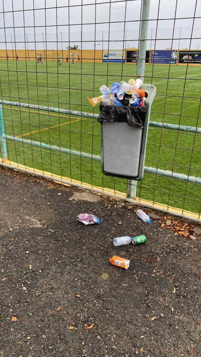 Un grupo de padres denuncia a través de ONDAGUANCHE el lamentable aspecto que presenta las instalaciones del campo de fútbol de Las Remudas en Telde. Este domingo, mientras sus hijos juegan, ellos se tienen que sentar en unas gradas que están sucias y con basura de meses rebosando las papeleras. Da pena que ningún responsable municipal mire lo más mínimo por la limpieza de estas históricas instalaciones de la ciudad.