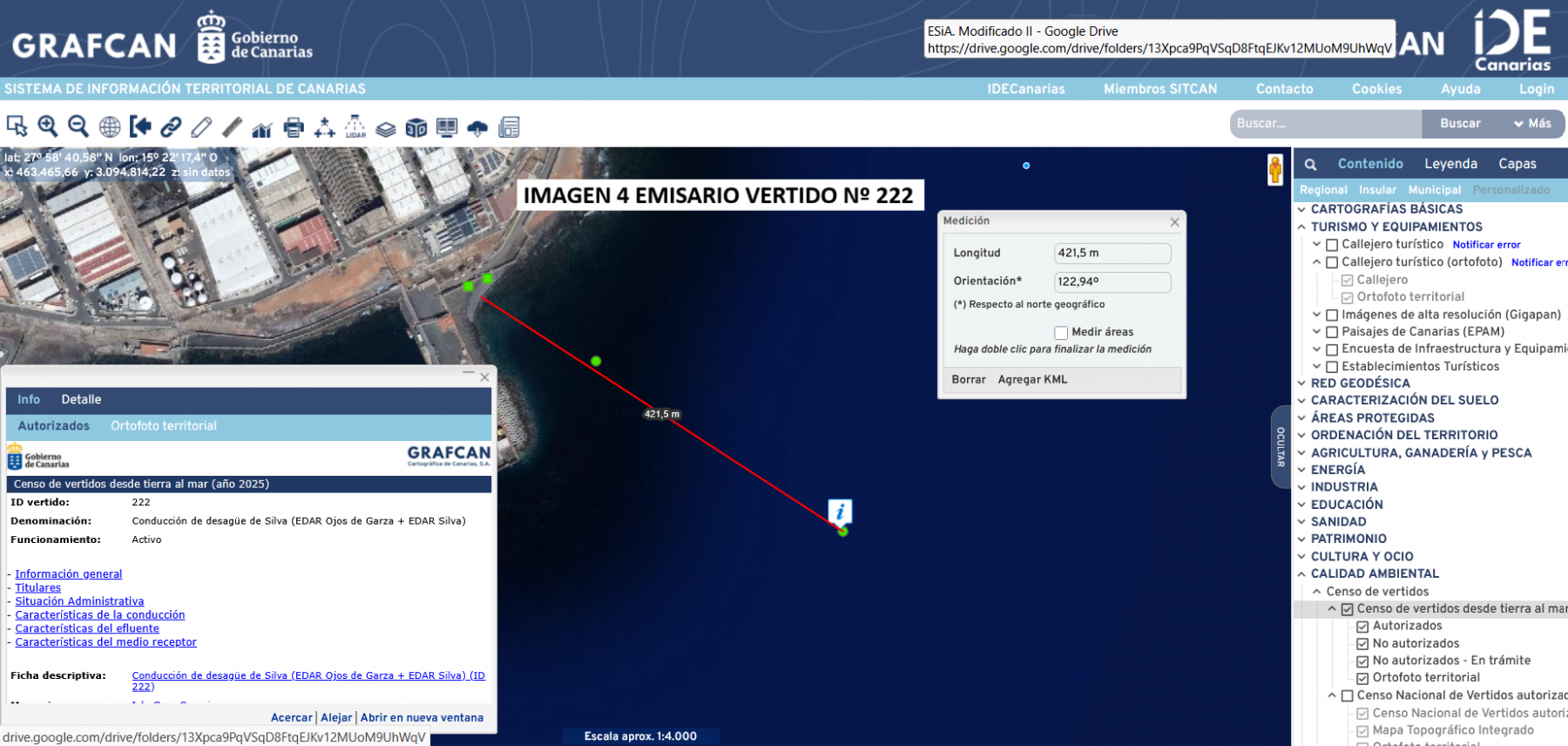 Utilizando la herramienta que la propia aplicación Grafcan ofrece para medir distancias, se comprueba que la boca del emisario 222 se encuentra a 421,5 metros de la costa.