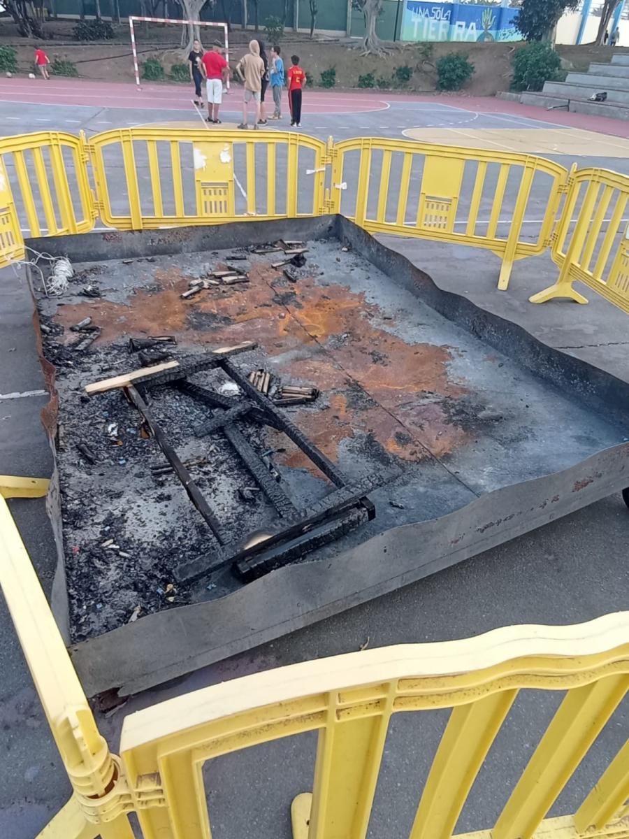 Por si este despropósito fuera poco, nos encontramos que 72 horas después, en el lugar donde quemaron el ‘longorón’ (centro de la cancha deportiva del Parque Urbano de San Juan), todavía no han retirado el recipiente metálico donde ardió todo.